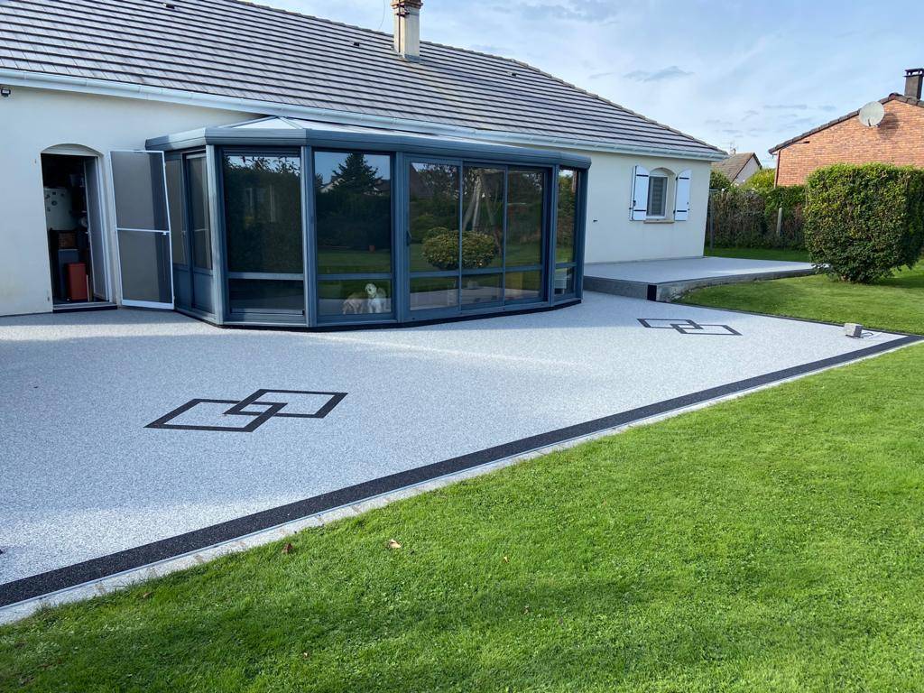 Sur cette terrasse proche de FECAMP , nous avons procéder à la dépose du carrelage existant , pour ensuite effectuer une préparation des supports à l'aide de ragréage fibré , et enfin appliquer du granulats de marbre/résine.